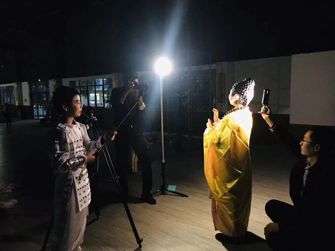 成庭明同学一人分饰沙僧和如来,那呆萌的眼神和胖嘟嘟的下脸,演这两个角色再合适不过了。我好不容易教会他做标准的说法印手势,但是不知怎么,就是拍不出如来的威严感来。王印说这个得背后打光,把头发边缘照亮。我又灵机一动,让他盯着馆内远处的一盏灯,使劲瞪大双眼,妥了!